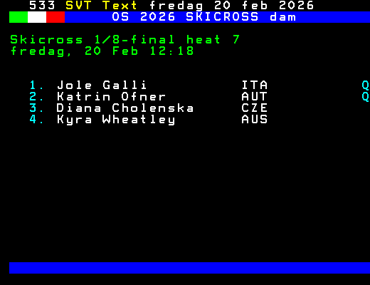 OS 2026 SKICROSS dam Skicross 1/8-final heat 7 fredag, 20 Feb 12:18 1. Jole Galli ITA Q 2. Katrin Ofner AUT Q 3. Diana Cholenska CZE 4. Kyra Wheatley AUS +Dela 61 dagar