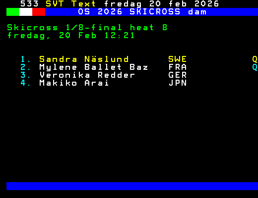 OS 2026 SKICROSS dam Skicross 1/8-final heat 8 fredag, 20 Feb 12:21 1. Sandra Näslund SWE Q 2. Mylene Ballet Baz FRA Q 3. Veronika Redder GER 4. Makiko Arai JPN +Dela 61 dagar