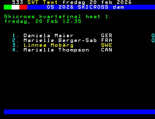 OS 2026 SKICROSS dam Skicross kvartsfinal heat 1 fredag, 20 Feb 12:35 1. Daniela Maier GER Q 2. Marielle Berger-Sab FRA Q 3. Linnea Mobärg SWE 4. Marielle Thompson CAN +Dela 61 dagar