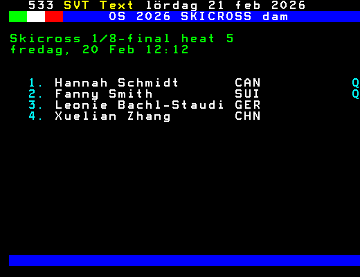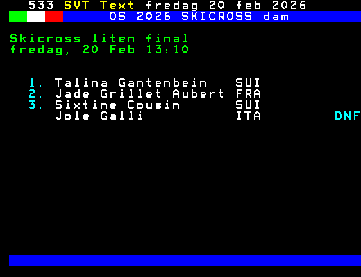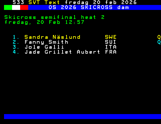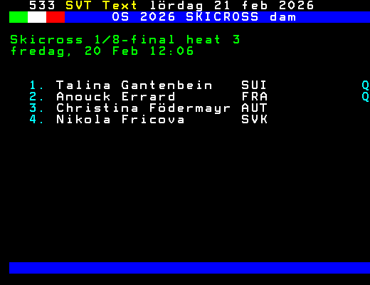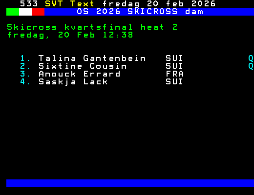 OS 2026 SKICROSS dam Skicross kvartsfinal heat 2 fredag, 20 Feb 12:38 1. Talina Gantenbein SUI Q 2. Sixtine Cousin SUI Q 3. Anouck Errard FRA 4. Saskja Lack SUI +Dela 61 dagar