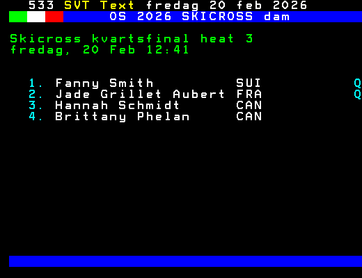 OS 2026 SKICROSS dam Skicross kvartsfinal heat 3 fredag, 20 Feb 12:41 1. Fanny Smith SUI Q 2. Jade Grillet Aubert FRA Q 3. Hannah Schmidt CAN 4. Brittany Phelan CAN +Dela 61 dagar