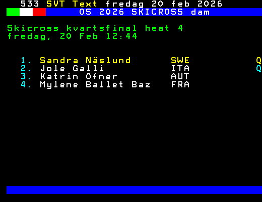OS 2026 SKICROSS dam Skicross kvartsfinal heat 4 fredag, 20 Feb 12:44 1. Sandra Näslund SWE Q 2. Jole Galli ITA Q 3. Katrin Ofner AUT 4. Mylene Ballet Baz FRA +Dela 61 dagar