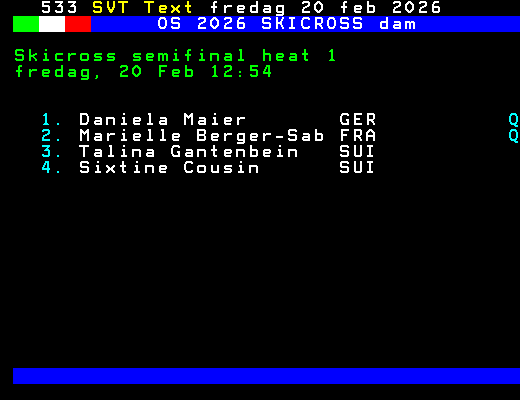 OS 2026 SKICROSS dam Skicross semifinal heat 1 fredag, 20 Feb 12:54 1. Daniela Maier GER Q 2. Marielle Berger-Sab FRA Q 3. Talina Gantenbein SUI 4. Sixtine Cousin SUI +Dela 61 dagar