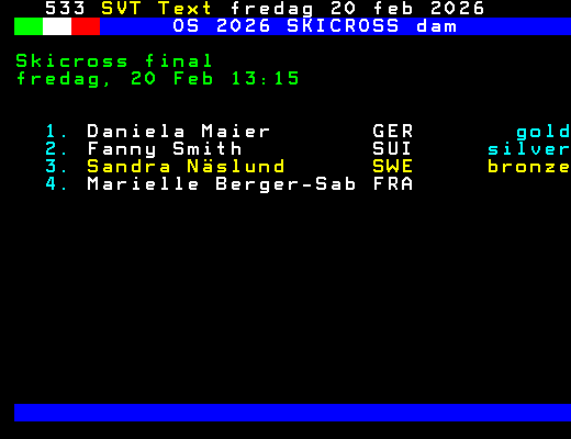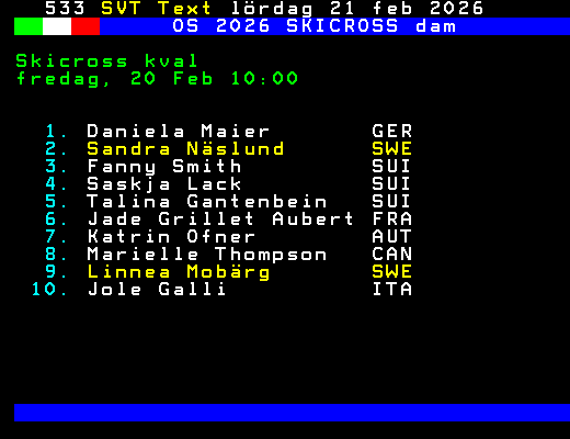 SVT Text Lör 21 Feb. 2026 OS 2026 SKICROSS dam Skicross kval fredag, 20 Feb 10:00 1. Daniela Maier GER 2. Sandra Näslund SWE 3. Fanny Smith SUI 4. Saskja Lack SUI 5. Talina Gantenbein SUI 6. Jade Grillet Aubert FRA 7. Katrin Ofner AUT 8. Marielle Thompson CAN 9. Linnea Mobärg SWE 10. Jole Galli ITA +Dela 61 dagar