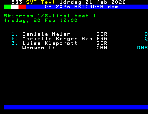 OS 2026 SKICROSS dam Skicross 1/8-final heat 1 fredag, 20 Feb 12:00 1. Daniela Maier GER Q 2. Marielle Berger-Sab FRA Q 3. Luisa Klapprott GER Wenwen Li CHN DNS +Dela 61 dagar