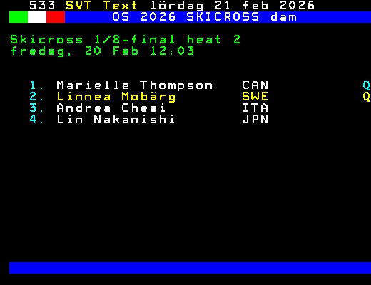 OS 2026 SKICROSS dam Skicross 1/8-final heat 2 fredag, 20 Feb 12:03 1. Marielle Thompson CAN Q 2. Linnea Mobärg SWE Q 3. Andrea Chesi ITA 4. Lin Nakanishi JPN +Dela 61 dagar
