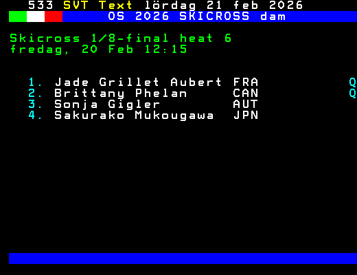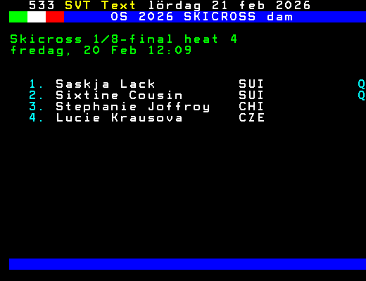 OS 2026 SKICROSS dam Skicross 1/8-final heat 4 fredag, 20 Feb 12:09 1. Saskja Lack SUI Q 2. Sixtine Cousin SUI Q 3. Stephanie Joffroy CHI 4. Lucie Krausova CZE +Dela 61 dagar