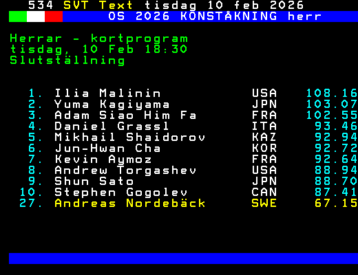 SVT Text Tis 10 Feb. 2026 OS 2026 KONSTÅKNING herr Herrar - kortprogram tisdag, 10 Feb 18:30 Slutställning 1. Ilia Malinin USA 108.16 2. Yuma Kagiyama JPN 103.07 3. Adam Siao Him Fa FRA 102.55 4. Daniel Grassl ITA 93.46 5. Mikhail Shaidorov KAZ 92.94 6. Jun-Hwan Cha KOR 92.72 7. Kevin Aymoz FRA 92.64 8. Andrew Torgashev USA 88.94 9. Shun Sato JPN 88.70 10. Stephen Gogolev CAN 87.41 27. Andreas Nordebäck SWE 67.15 +Dela 71 dagar
