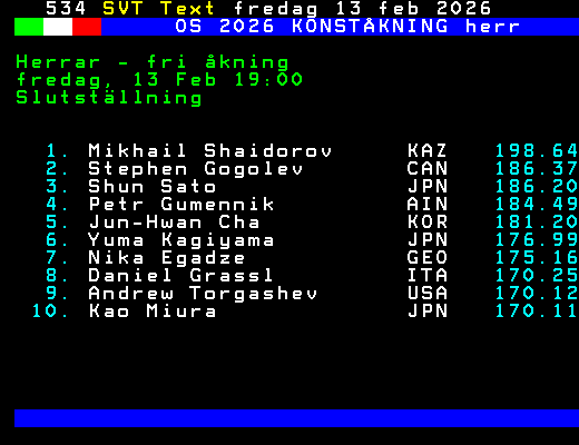 OS 2026 KONSTÅKNING herr Herrar - fri åkning fredag, 13 Feb 19:00 Slutställning 1. Mikhail Shaidorov KAZ 198.64 2. Stephen Gogolev CAN 186.37 3. Shun Sato JPN 186.20 4. Petr Gumennik AIN 184.49 5. Jun-Hwan Cha KOR 181.20 6. Yuma Kagiyama JPN 176.99 7. Nika Egadze GEO 175.16 8. Daniel Grassl ITA 170.25 9. Andrew Torgashev USA 170.12 10. Kao Miura JPN 170.11 +Dela 68 dagar