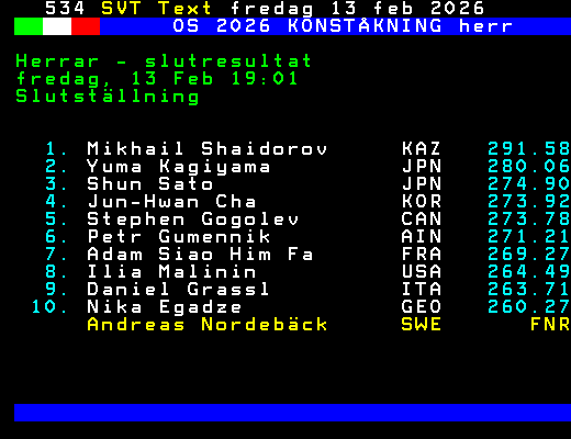 OS 2026 KONSTÅKNING herr Herrar - slutresultat fredag, 13 Feb 19:01 Slutställning 1. Mikhail Shaidorov KAZ 291.58 2. Yuma Kagiyama JPN 280.06 3. Shun Sato JPN 274.90 4. Jun-Hwan Cha KOR 273.92 5. Stephen Gogolev CAN 273.78 6. Petr Gumennik AIN 271.21 7. Adam Siao Him Fa FRA 269.27 8. Ilia Malinin USA 264.49 9. Daniel Grassl ITA 263.71 10. Nika Egadze GEO 260.27 Andreas Nordebäck SWE FNR +Dela 68 dagar