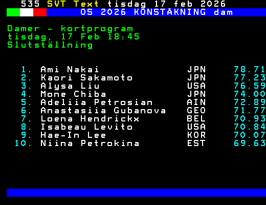 SVT Text Tis 17 Feb. 2026 OS 2026 KONSTÅKNING dam Damer - kortprogram tisdag, 17 Feb 18:45 Slutställning 1. Ami Nakai JPN 78.71 2. Kaori Sakamoto JPN 77.23 3. Alysa Liu USA 76.59 4. Mone Chiba JPN 74.00 5. Adeliia Petrosian AIN 72.89 6. Anastasiia Gubanova GEO 71.77 7. Loena Hendrickx BEL 70.93 8. Isabeau Levito USA 70.84 9. Hae-In Lee KOR 70.07 10. Niina Petrokina EST 69.63 +Dela 64 dagar