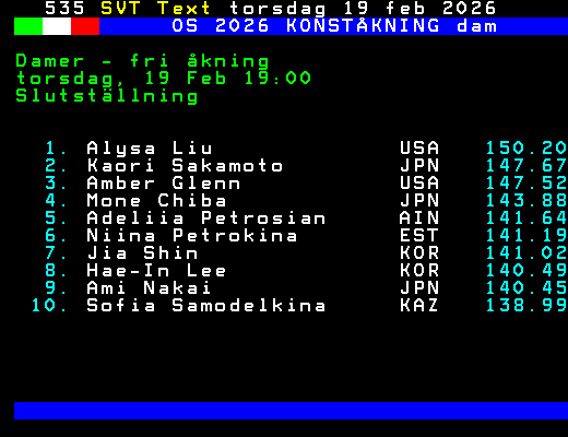 OS 2026 KONSTÅKNING dam Damer - fri åkning torsdag, 19 Feb 19:00 Slutställning 1. Alysa Liu USA 150.20 2. Kaori Sakamoto JPN 147.67 3. Amber Glenn USA 147.52 4. Mone Chiba JPN 143.88 5. Adeliia Petrosian AIN 141.64 6. Niina Petrokina EST 141.19 7. Jia Shin KOR 141.02 8. Hae-In Lee KOR 140.49 9. Ami Nakai JPN 140.45 10. Sofia Samodelkina KAZ 138.99 +Dela 62 dagar