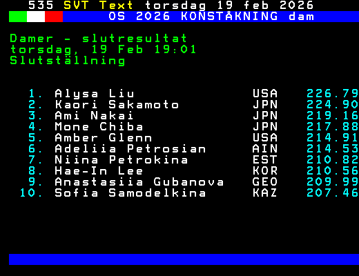OS 2026 KONSTÅKNING dam Damer - slutresultat torsdag, 19 Feb 19:01 Slutställning 1. Alysa Liu USA 226.79 2. Kaori Sakamoto JPN 224.90 3. Ami Nakai JPN 219.16 4. Mone Chiba JPN 217.88 5. Amber Glenn USA 214.91 6. Adeliia Petrosian AIN 214.53 7. Niina Petrokina EST 210.82 8. Hae-In Lee KOR 210.56 9. Anastasiia Gubanova GEO 209.99 10. Sofia Samodelkina KAZ 207.46 +Dela 62 dagar