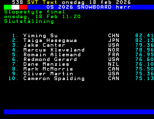 SVT Text Ons 18 Feb. 2026 OS 2026 SNOWBOARD herr Slopestyle final onsdag, 18 Feb 11:20 Slutställning 1. Yiming Su CHN 82.41 2. Taiga Hasegawa JPN 82.13 3. Jake Canter USA 79.36 4. Marcus Kleveland NOR 78.96 5. Romain Allemand FRA 76.95 6. Redmond Gerard USA 76.60 7. Dane Menzies NZL 76.10 8. Mark McMorris CAN 75.50 9. Oliver Martin USA 75.36 10. Cameron Spalding CAN 75.13 +Dela 63 dagar