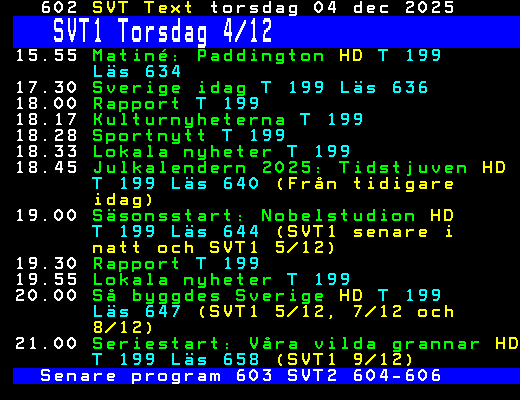 SVT Text Tors 04 Dec. 2025 SVT1 Torsdag 4/12 15.55 Matiné: Paddington HD T 199 Läs 634 17.30 Sverige idag T 199 Läs 636 18.00 Rapport T 199 18.17 Kulturnyheterna T 199 18.28 Sportnytt T 199 18.33 Lokala nyheter T 199 18.45 Julkalendern 2025: Tidstjuven HD T 199 Läs 640 (Från tidigare idag) 19.00 Säsonsstart: Nobelstudion HD T 199 Läs 644 (SVT1 senare i natt och SVT1 5/12) 19.30 Rapport T 199 19.55 Lokala nyheter T 199 20.00 Så byggdes Sverige HD T 199 Läs 647 (SVT1 5/12, 7/12 och 8/12) 21.00 Seriestart: Våra vilda grannar HD T 199 Läs 658 (SVT1 9/12) Senare program 603 SVT2 604-606 +Dela 09:50