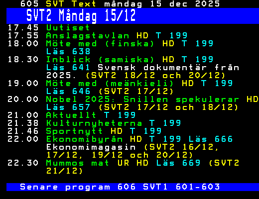 SVT Text Mån 15 Dec. 2025 SVT2 Måndag 15/12 17.45 Uutiset 17.55 Anslagstavlan HD T 199 18.00 Möte med (finska) HD T 199 Läs 638 18.30 Inblick (samiska) HD T 199 Läs 641 Svensk dokumentär från 2025. (SVT2 18/12 och 20/12) 19.00 Möte med (meänkieli) HD T 199 Läs 646 (SVT2 17/12) 20.00 Nobel 2025: Snillen spekulerar HD Läs 657 (SVT2 17/12 och 18/12) 21.00 Aktuellt T 199 21.38 Kulturnyheterna T 199 21.46 Sportnytt HD T 199 22.00 Ekonomibyrån HD T 199 Läs 666 Ekonomimagasin (SVT2 16/12, 17/12, 19/12 och 20/12) 22.30 Mummos mat UR HD Läs 669 (SVT2 21/12) Senare program 606 SVT1 601-603 +Dela 06:05