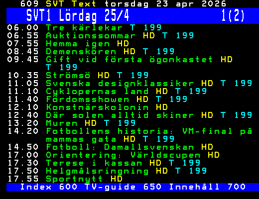 SVT Text Tors 23 Apr. 2026 SVT1 Lördag 25/4 1(2) 06.00 Tre kärlekar T 199 06.55 Auktionssommar HD T 199 07.55 Hemma igen HD 08.45 Demenskören HD T 199 09.45 Gift vid första ögonkastet HD T 199 10.35 Strömsö HD T 199 11.05 Svenska designklassiker HD T 199 11.10 Cyklopernas land HD T 199 11.40 Fördomsshowen HD T 199 12.10 Konstnärskolonin HD 12.40 Där solen alltid skiner HD T 199 13.20 Muren HD T 199 14.20 Fotbollens historia: VM-final på mammas gata HD T 199 14.50 Fotboll: Damallsvenskan HD 17.00 Orientering: Världscupen HD 17.30 Terese i kassan HD T 199 17.50 Helgmålsringning HD T 199 17.55 Sportnytt HD Index 600 TV-guide 650 Innehåll 700 +Dela 06:05