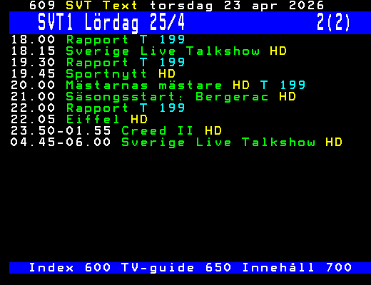 SVT1 Lördag 25/4 2(2) 18.00 Rapport T 199 18.15 Sverige Live Talkshow HD 19.30 Rapport T 199 19.45 Sportnytt HD 20.00 Mästarnas mästare HD T 199 21.00 Säsongsstart: Bergerac HD 22.00 Rapport T 199 22.05 Eiffel HD 23.50-01.55 Creed II HD 04.45-06.00 Sverige Live Talkshow HD Index 600 TV-guide 650 Innehåll 700 +Dela 06:05