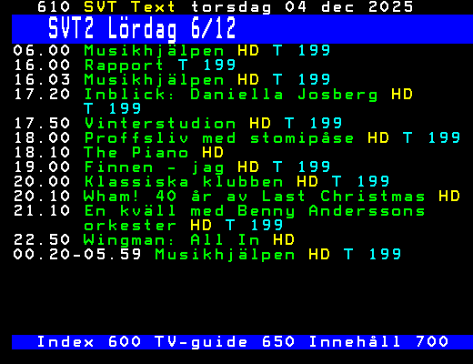 SVT Text Tors 04 Dec. 2025 SVT2 Lördag 6/12 06.00 Musikhjälpen HD T 199 16.00 Rapport T 199 16.03 Musikhjälpen HD T 199 17.20 Inblick: Daniella Josberg HD T 199 17.50 Vinterstudion HD T 199 18.00 Proffsliv med stomipåse HD T 199 18.10 The Piano HD 19.00 Finnen - jag HD T 199 20.00 Klassiska klubben HD T 199 20.10 Wham! 40 år av Last Christmas HD 21.10 En kväll med Benny Anderssons orkester HD T 199 22.50 Wingman: All In HD 00.20-05.59 Musikhjälpen HD T 199 Index 600 TV-guide 650 Innehåll 700 +Dela 06:05