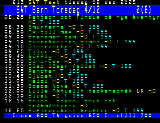 SVT Barn Torsdag 4/12 2(6) 08.25 Pettson och Findus på nya äventyr HD T 199 08.35 Smurfarna HD T 199 08.50 Ax till max HD T 199 09.00 Brandman Sam HD T 199 09.10 Superkaninen Simon HD T 199 09.15 Dinoranchen HD T 199 09.25 Tilde HD T 199 09.40 Våfflan HD T 199 09.50 Dino-Dex HD T 199 10.00 Cleo löser fallet HD T 199 10.25 Ranchen T 199 10.45 Djupet HD T 199 11.05 Heidi HD T 199 11.30 Space Nova HD T 199 12.00 Lilla Aktuellt teckenspråk UR HD 12.10 Bluey HD T 199 12.15 Snipp, Snapp, Snut och tråkmånsarna HD 12.25 Safirdrakens krafter HD T 199 Index 600 TV-guide 650 Innehåll 700 +Dela 2 dagar