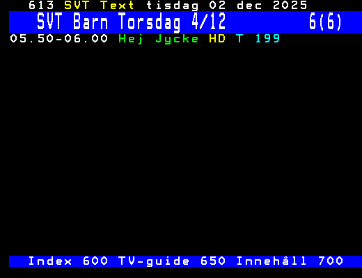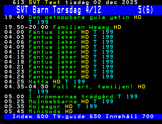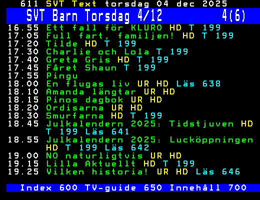 SVT Barn Torsdag 4/12 4(6) 16.55 Ett fall för KLURO HD T 199 17.05 Full fart, familjen! HD T 199 17.20 Tilde HD T 199 17.30 Charlie och Lola T 199 17.40 Greta Gris HD T 199 17.45 Fåret Shaun T 199 17.55 Pingu 18.00 En flugas liv UR HD Läs 638 18.10 Amanda längtar UR HD 18.15 Pinos dagbok UR HD 18.20 Ordisarna UR HD 18.30 Smurfarna HD T 199 18.45 Julkalendern 2025: Tidstjuven HD T 199 Läs 641 18.55 Julkalendern 2025: Lucköppningen HD T 199 Läs 642 19.00 NO naturligtvis UR HD 19.15 Lilla Aktuellt HD T 199 19.25 Vilken historia! UR HD Läs 646 Index 600 TV-guide 650 Innehåll 700 +Dela 06:05