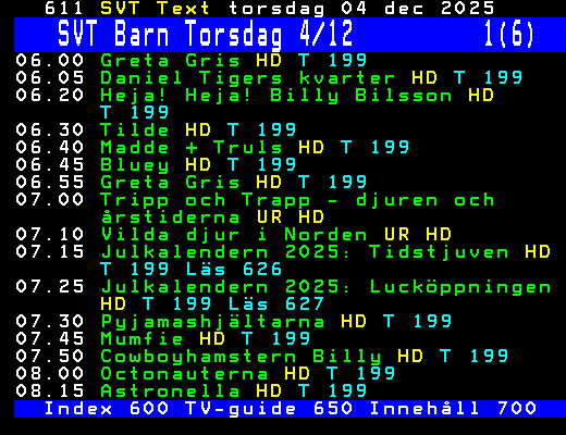 SVT Text Tors 04 Dec. 2025 SVT Barn Torsdag 4/12 1(6) 06.00 Greta Gris HD T 199 06.05 Daniel Tigers kvarter HD T 199 06.20 Heja! Heja! Billy Bilsson HD T 199 06.30 Tilde HD T 199 06.40 Madde + Truls HD T 199 06.45 Bluey HD T 199 06.55 Greta Gris HD T 199 07.00 Tripp och Trapp - djuren och årstiderna UR HD 07.10 Vilda djur i Norden UR HD 07.15 Julkalendern 2025: Tidstjuven HD T 199 Läs 626 07.25 Julkalendern 2025: Lucköppningen HD T 199 Läs 627 07.30 Pyjamashjältarna HD T 199 07.45 Mumfie HD T 199 07.50 Cowboyhamstern Billy HD T 199 08.00 Octonauterna HD T 199 08.15 Astronella HD T 199 Index 600 TV-guide 650 Innehåll 700 +Dela 06:05