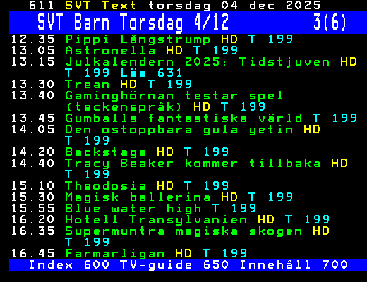 SVT Barn Torsdag 4/12 3(6) 12.35 Pippi Långstrump HD T 199 13.05 Astronella HD T 199 13.15 Julkalendern 2025: Tidstjuven HD T 199 Läs 631 13.30 Trean HD T 199 13.40 Gaminghörnan testar spel (teckenspråk) HD T 199 13.45 Gumballs fantastiska värld T 199 14.05 Den ostoppbara gula yetin HD T 199 14.20 Backstage HD T 199 14.40 Tracy Beaker kommer tillbaka HD T 199 15.10 Theodosia HD T 199 15.30 Magisk ballerina HD T 199 15.55 Blue water high T 199 16.20 Hotell Transylvanien HD T 199 16.35 Supermuntra magiska skogen HD T 199 16.45 Farmarligan HD T 199 Index 600 TV-guide 650 Innehåll 700 +Dela 06:05