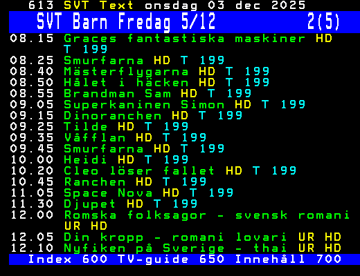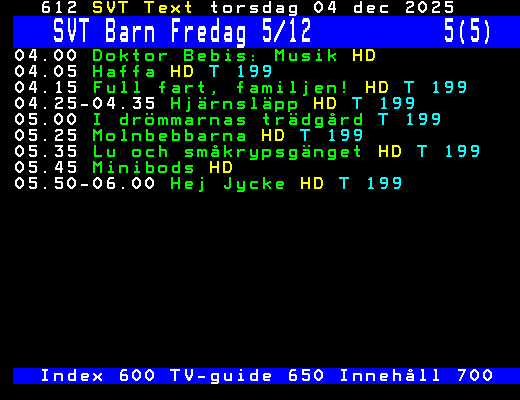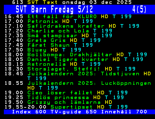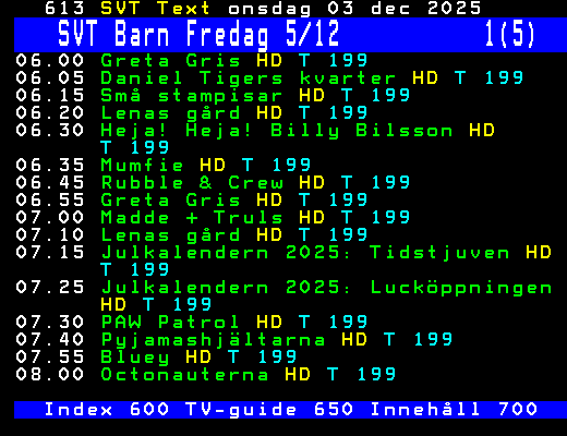 SVT Text Ons 03 Dec. 2025 SVT Barn Fredag 5/12 1(5) 06.00 Greta Gris HD T 199 06.05 Daniel Tigers kvarter HD T 199 06.15 Små stampisar HD T 199 06.20 Lenas gård HD T 199 06.30 Heja! Heja! Billy Bilsson HD T 199 06.35 Mumfie HD T 199 06.45 Rubble & Crew HD T 199 06.55 Greta Gris HD T 199 07.00 Madde + Truls HD T 199 07.10 Lenas gård HD T 199 07.15 Julkalendern 2025: Tidstjuven HD T 199 07.25 Julkalendern 2025: Lucköppningen HD T 199 07.30 PAW Patrol HD T 199 07.40 Pyjamashjältarna HD T 199 07.55 Bluey HD T 199 08.00 Octonauterna HD T 199 Index 600 TV-guide 650 Innehåll 700 +Dela Igår 06:05