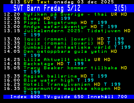 SVT Barn Fredag 5/12 3(5) 12.20 Nyfiken på Sverige - thai UR HD 12.30 Bluey HD T 199 12.35 Pippi Långstrump HD T 199 13.00 Andys safariäventyr HD T 199 13.15 Julkalendern 2025: Tidstjuven HD T 199 13.30 1quiz (romani lovari) HD T 199 13.35 1quiz (romani lovari) HD T 199 13.45 Gumballs fantastiska värld T 199 14.05 Den ostoppbara gula yetin HD T 199 14.25 Lilla Aktuellt skola UR HD 14.45 Backstage HD T 199 15.05 Tracy Beaker kommer tillbaka HD T 199 15.35 Magisk ballerina HD T 199 16.00 Blue water high T 199 16.25 Hotell Transylvanien HD T 199 16.35 Supermuntra magiska skogen HD T 199 Index 600 TV-guide 650 Innehåll 700 +Dela Igår 06:05