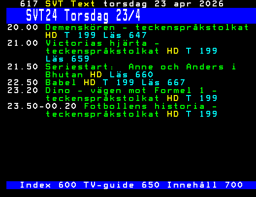 SVT Text Tors 23 Apr. 2026 SVT24 Torsdag 23/4 20.00 Demenskören - teckenspråkstolkat HD T 199 Läs 647 21.00 Victorias hjärta - teckenspråkstolkat HD T 199 Läs 659 21.50 Seriestart: Anne och Anders i Bhutan HD Läs 660 22.50 Babel HD T 199 Läs 667 23.20 Dino - vägen mot Formel 1 - teckenspråkstolkat HD T 199 23.50-00.20 Fotbollens historia - teckenspråkstolkat HD T 199 Index 600 TV-guide 650 Innehåll 700 +Dela 06:05