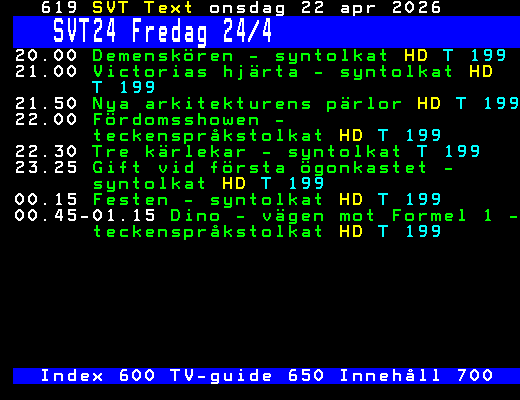 SVT Text Ons 22 Apr. 2026 SVT24 Fredag 24/4 20.00 Demenskören - syntolkat HD T 199 21.00 Victorias hjärta - syntolkat HD T 199 21.50 Nya arkitekturens pärlor HD T 199 22.00 Fördomsshowen - teckenspråkstolkat HD T 199 22.30 Tre kärlekar - syntolkat T 199 23.25 Gift vid första ögonkastet - syntolkat HD T 199 00.15 Festen - syntolkat HD T 199 00.45-01.15 Dino - vägen mot Formel 1 - teckenspråkstolkat HD T 199 Index 600 TV-guide 650 Innehåll 700 +Dela Igår 06:05