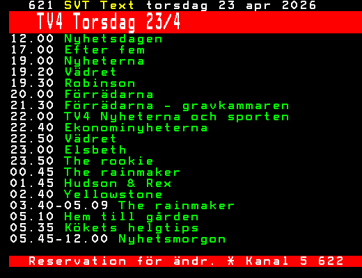 SVT Text Tors 23 Apr. 2026 TV4 Torsdag 23/4 12.00 Nyhetsdagen 17.00 Efter fem 19.00 Nyheterna 19.20 Vädret 19.30 Robinson 20.00 Förrädarna 21.30 Förrädarna - gravkammaren 22.00 TV4 Nyheterna och sporten 22.40 Ekonominyheterna 22.50 Vädret 23.00 Elsbeth 23.50 The rookie 00.45 The rainmaker 01.45 Hudson & Rex 02.40 Yellowstone 03.40-05.09 The rainmaker 05.10 Hem till gården 05.35 Kökets helgtips 05.45-12.00 Nyhetsmorgon Reservation för ändr. * Kanal 5 622 +Dela 06:05