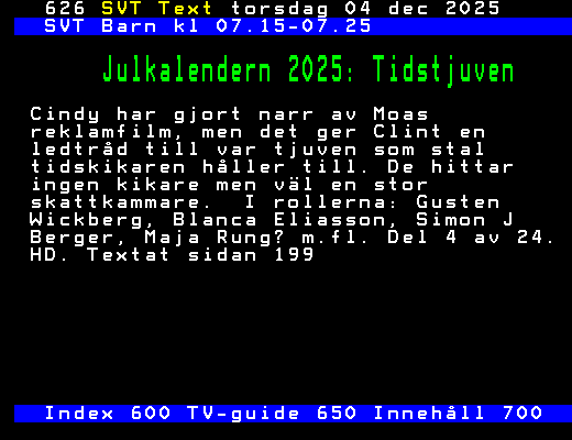 SVT Text Tors 04 Dec. 2025 SVT Barn kl 07.15-07.25 Julkalendern 2025: Tidstjuven Cindy har gjort narr av Moas reklamfilm, men det ger Clint en ledtråd till var tjuven som stal tidskikaren håller till. De hittar ingen kikare men väl en stor skattkammare. I rollerna: Gusten Wickberg, Blanca Eliasson, Simon J Berger, Maja Rung? m.fl. Del 4 av 24. HD. Textat sidan 199 Index 600 TV-guide 650 Innehåll 700 +Dela 06:05