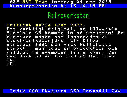 SVT Text Tors 04 Dec. 2025 Kunskapskanalen kl 18.10-18.55 Retroverkstan Brittisk serie från 2023. Ett verkligt original, en 1980-tals Sinclair C5 kommer in på verkstan! En eldriven moped som lanserades av elektronikpionjären sir Clive Sinclair 1985 och fick kultstatus direkt - men togs ur produktion och väldigt få exemplar finns kvar. Var den dock 30 år för tidig? Del 2 av 10. HD. Index 600 TV-guide 650 Innehåll 700 +Dela 09:50