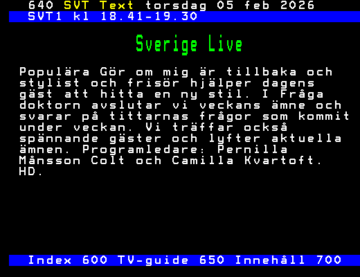 SVT Text Tors 05 Feb. 2026 SVT1 kl 18.41-19.30 Sverige Live Populära Gör om mig är tillbaka och stylist och frisör hjälper dagens gäst att hitta en ny stil. I Fråga doktorn avslutar vi veckans ämne och svarar på tittarnas frågor som kommit under veckan. Vi träffar också spännande gäster och lyfter aktuella ämnen. Programledare: Pernilla Månsson Colt och Camilla Kvartoft. HD. Index 600 TV-guide 650 Innehåll 700 +Dela 77 dagar