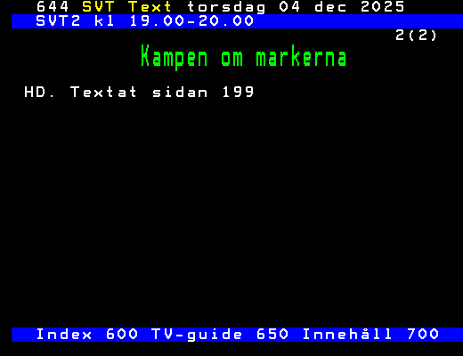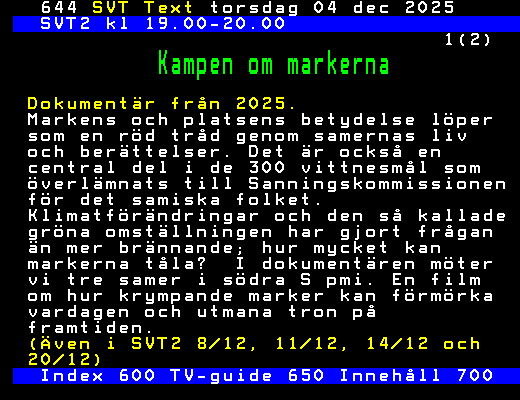 SVT Text Tors 04 Dec. 2025 SVT2 kl 19.00-20.00 1(2) Kampen om markerna Dokumentär från 2025. Markens och platsens betydelse löper som en röd tråd genom samernas liv och berättelser. Det är också en central del i de 300 vittnesmål som överlämnats till Sanningskommissionen för det samiska folket. Klimatförändringar och den så kallade gröna omställningen har gjort frågan än mer brännande; hur mycket kan markerna tåla? I dokumentären möter vi tre samer i södra S pmi. En film om hur krympande marker kan förmörka vardagen och utmana tron på framtiden. (Även i SVT2 8/12, 11/12, 14/12 och 20/12) Index 600 TV-guide 650 Innehåll 700 +Dela 06:05