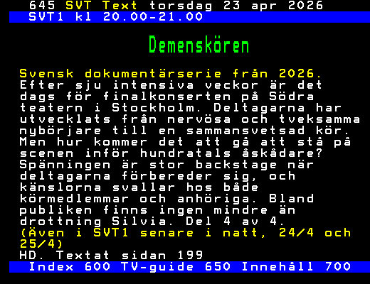 SVT Text Tors 23 Apr. 2026 SVT1 kl 20.00-21.00 Demenskören Svensk dokumentärserie från 2026. Efter sju intensiva veckor är det dags för finalkonserten på Södra teatern i Stockholm. Deltagarna har utvecklats från nervösa och tveksamma nybörjare till en sammansvetsad kör. Men hur kommer det att gå att stå på scenen inför hundratals åskådare? Spänningen är stor backstage när deltagarna förbereder sig, och känslorna svallar hos både körmedlemmar och anhöriga. Bland publiken finns ingen mindre än drottning Silvia. Del 4 av 4. (Även i SVT1 senare i natt, 24/4 och 25/4) HD. Textat sidan 199 Index 600 TV-guide 650 Innehåll 700 +Dela 06:05