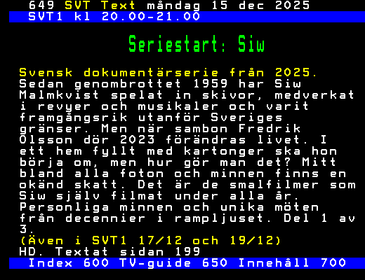 SVT Text Mån 15 Dec. 2025 SVT1 kl 20.00-21.00 Seriestart: Siw Svensk dokumentärserie från 2025. Sedan genombrottet 1959 har Siw Malmkvist spelat in skivor, medverkat i revyer och musikaler och varit framgångsrik utanför Sveriges gränser. Men när sambon Fredrik Olsson dör 2023 förändras livet. I ett hem fyllt med kartonger ska hon börja om, men hur gör man det? Mitt bland alla foton och minnen finns en okänd skatt. Det är de smalfilmer som Siw själv filmat under alla år. Personliga minnen och unika möten från decennier i rampljuset. Del 1 av 3. (Även i SVT1 17/12 och 19/12) HD. Textat sidan 199 Index 600 TV-guide 650 Innehåll 700 +Dela 06:05