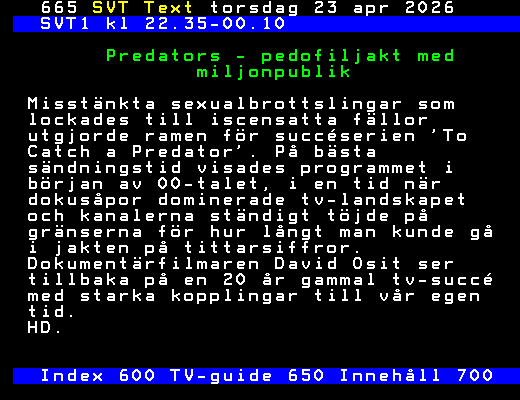 SVT Text Tors 23 Apr. 2026 SVT1 kl 22.35-00.10 Predators - pedofiljakt med miljonpublik Misstänkta sexualbrottslingar som lockades till iscensatta fällor utgjorde ramen för succéserien 'To Catch a Predator'. På bästa sändningstid visades programmet i början av 00-talet, i en tid när dokusåpor dominerade tv-landskapet och kanalerna ständigt töjde på gränserna för hur långt man kunde gå i jakten på tittarsiffror. Dokumentärfilmaren David Osit ser tillbaka på en 20 år gammal tv-succé med starka kopplingar till vår egen tid. HD. Index 600 TV-guide 650 Innehåll 700 +Dela 06:05