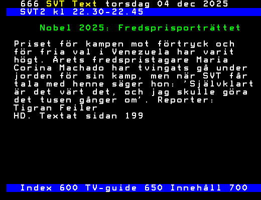 SVT Text Tors 04 Dec. 2025 SVT2 kl 22.30-22.45 Nobel 2025: Fredsprisporträttet Priset för kampen mot förtryck och för fria val i Venezuela har varit högt. Årets fredspristagare Maria Corina Machado har tvingats gå under jorden för sin kamp, men när SVT får tala med henne säger hon: 'Självklart är det värt det, och jag skulle göra det tusen gånger om'. Reporter: Tigran Feiler HD. Textat sidan 199 Index 600 TV-guide 650 Innehåll 700 +Dela 06:05