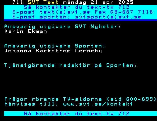 SVT Text Tors 23 Apr. 2026 Så kontaktar du text-tv 712 E-post text(a)svt.se Fax 08-667 7116 E-post sporten: svtsport(a)svt.se Ansvarig utgivare SVT Nyheter: Karin Ekman Ansvarig utgivare Sporten: Johanna Bäckström Lerneby Tjänstgörande redaktör på Sporten: Frågor rörande TV-sidorna (sid 600-699) hänvisas till: www.svt.se/kontakt Så kontaktar du text-tv 712 +Dela 366 dagar