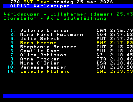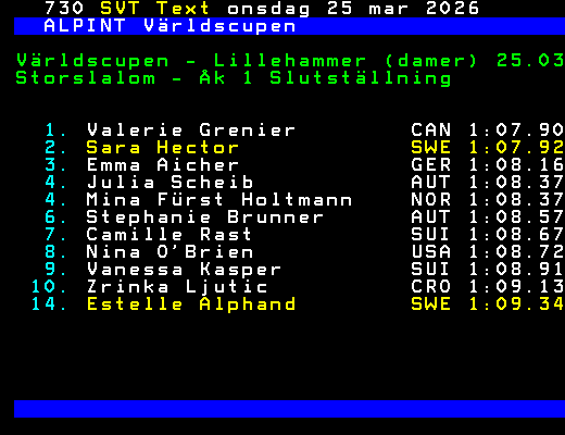 SVT Text Ons 25 Mars 2026 ALPINT Världscupen Världscupen - Lillehammer (damer) 25.03 Storslalom - Åk 1 Slutställning 1. Valerie Grenier CAN 1:07.90 2. Sara Hector SWE 1:07.92 3. Emma Aicher GER 1:08.16 4. Julia Scheib AUT 1:08.37 4. Mina Fürst Holtmann NOR 1:08.37 6. Stephanie Brunner AUT 1:08.57 7. Camille Rast SUI 1:08.67 8. Nina O'Brien USA 1:08.72 9. Vanessa Kasper SUI 1:08.91 10. Zrinka Ljutic CRO 1:09.13 14. Estelle Alphand SWE 1:09.34 +Dela 29 dagar