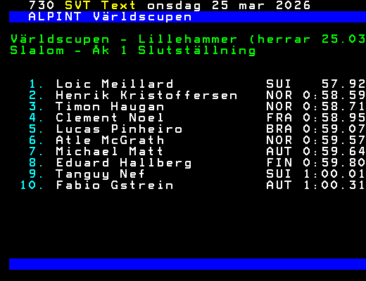 ALPINT Världscupen Världscupen - Lillehammer (herrar 25.03 Slalom - Åk 1 Slutställning 1. Loic Meillard SUI 57.92 2. Henrik Kristoffersen NOR 0:58.59 3. Timon Haugan NOR 0:58.71 4. Clement Noel FRA 0:58.95 5. Lucas Pinheiro BRA 0:59.07 6. Atle McGrath NOR 0:59.57 7. Michael Matt AUT 0:59.64 8. Eduard Hallberg FIN 0:59.80 9. Tanguy Nef SUI 1:00.01 10. Fabio Gstrein AUT 1:00.31 +Dela 29 dagar