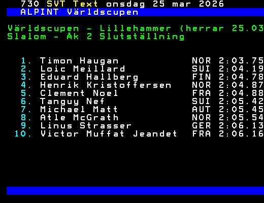 ALPINT Världscupen Världscupen - Lillehammer (herrar 25.03 Slalom - Åk 2 Slutställning 1. Timon Haugan NOR 2:03.75 2. Loic Meillard SUI 2:04.19 3. Eduard Hallberg FIN 2:04.78 4. Henrik Kristoffersen NOR 2:04.87 5. Clement Noel FRA 2:04.88 6. Tanguy Nef SUI 2:05.42 7. Michael Matt AUT 2:05.45 8. Atle McGrath NOR 2:05.54 9. Linus Strasser GER 2:06.13 10. Victor Muffat Jeandet FRA 2:06.16 +Dela 28 dagar
