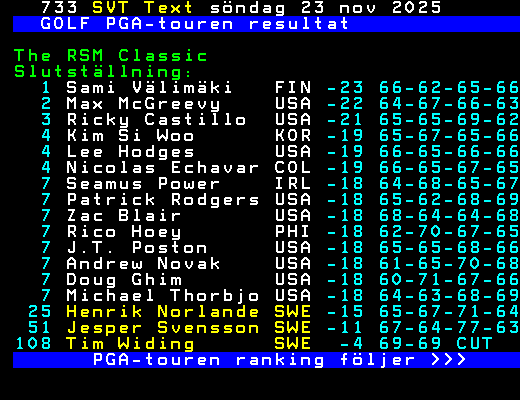 GOLF PGA-touren resultat The RSM Classic Slutställning: 1 Sami Välimäki FIN -23 66-62-65-66 2 Max McGreevy USA -22 64-67-66-63 3 Ricky Castillo USA -21 65-65-69-62 4 Kim Si Woo KOR -19 65-67-65-66 4 Lee Hodges USA -19 66-65-66-66 4 Nicolas Echavar COL -19 66-65-67-65 7 Seamus Power IRL -18 64-68-65-67 7 Patrick Rodgers USA -18 65-62-68-69 7 Zac Blair USA -18 68-64-64-68 7 Rico Hoey PHI -18 62-70-67-65 7 J.T. Poston USA -18 65-65-68-66 7 Andrew Novak USA -18 61-65-70-68 7 Doug Ghim USA -18 60-71-67-66 7 Michael Thorbjo USA -18 64-63-68-69 25 Henrik Norlande SWE -15 65-67-71-64 51 Jesper Svensson SWE -11 67-64-77-63 108 Tim Widing SWE -4 69-69 CUT PGA-touren ranking följer >>> +Dela 10 dagar