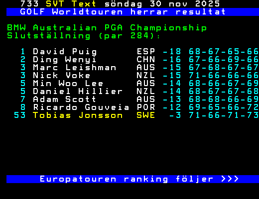 GOLF Worldtouren herrar resultat BMW Australian PGA Championship Slutställning (par 284): 1 David Puig ESP -18 68-67-65-66 2 Ding Wenyi CHN -16 67-66-69-66 3 Marc Leishman AUS -15 67-68-67-67 3 Nick Voke NZL -15 71-66-66-66 5 Min Woo Lee AUS -14 68-66-67-69 5 Daniel Hillier NZL -14 68-67-67-68 7 Adam Scott AUS -13 68-68-66-69 8 Ricardo Gouveia POR -12 69-65-66-72 53 Tobias Jonsson SWE -3 71-66-71-73 Europatouren ranking följer >>> +Dela 4 dagar