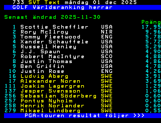 SVT Text Mån 01 Dec. 2025 GOLF Världsranking herrar Senast ändrad 2025-11-30 Poäng 1 Scottie Scheffler USA 17,95 2 Rory McIlroy NIR 9,96 3 Tommy Fleetwood ENG 5,78 4 Xander Schauffele USA 5,72 5 Russell Henley USA 5,29 6 J.J. Spaun USA 4,90 7 Robert MacIntyre SCO 4,88 8 Justin Thomas USA 4,86 9 Ben Griffin USA 4,78 10 Justin Rose ENG 4,26 16 Ludvig Åberg SWE 3,91 17 Alexander Noren SWE 3,69 111 Joakim Lagergren SWE 1,29 137 Jesper Svensson SWE 1,06 256 Sebastian Söderberg SWE 0,60 257 Pontus Nyholm SWE 0,60 258 Henrik Norlander SWE 0,60 279 Mikael Lindberg SWE 0,55 PGA-touren resultat följer >>> +Dela 3 dagar