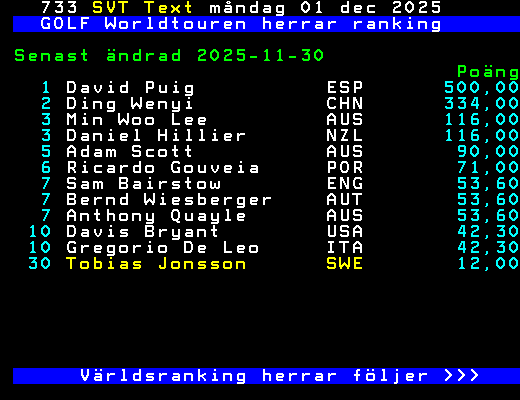 GOLF Worldtouren herrar ranking Senast ändrad 2025-11-30 Poäng 1 David Puig ESP 500,00 2 Ding Wenyi CHN 334,00 3 Min Woo Lee AUS 116,00 3 Daniel Hillier NZL 116,00 5 Adam Scott AUS 90,00 6 Ricardo Gouveia POR 71,00 7 Sam Bairstow ENG 53,60 7 Bernd Wiesberger AUT 53,60 7 Anthony Quayle AUS 53,60 10 Davis Bryant USA 42,30 10 Gregorio De Leo ITA 42,30 30 Tobias Jonsson SWE 12,00 Världsranking herrar följer >>> +Dela 3 dagar