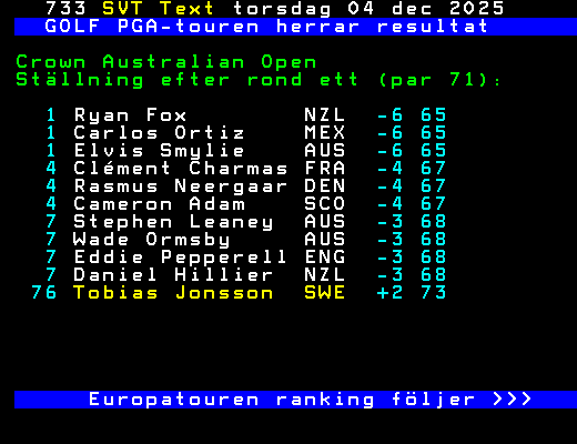 GOLF PGA-touren herrar resultat Crown Australian Open Ställning efter rond ett (par 71): 1 Ryan Fox NZL -6 65 1 Carlos Ortiz MEX -6 65 1 Elvis Smylie AUS -6 65 4 Clément Charmas FRA -4 67 4 Rasmus Neergaar DEN -4 67 4 Cameron Adam SCO -4 67 7 Stephen Leaney AUS -3 68 7 Wade Ormsby AUS -3 68 7 Eddie Pepperell ENG -3 68 7 Daniel Hillier NZL -3 68 76 Tobias Jonsson SWE +2 73 Europatouren ranking följer >>> +Dela 10:30
