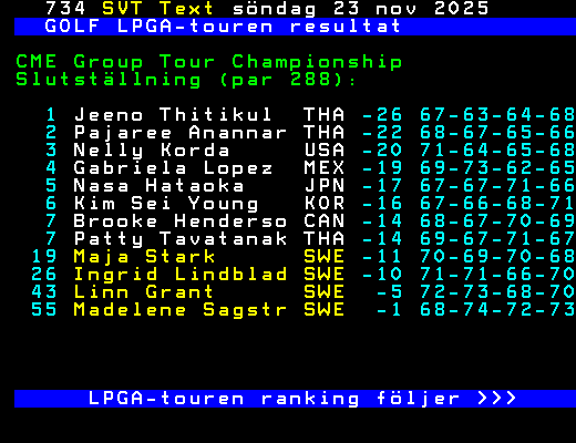 GOLF LPGA-touren resultat CME Group Tour Championship Slutställning (par 288): 1 Jeeno Thitikul THA -26 67-63-64-68 2 Pajaree Anannar THA -22 68-67-65-66 3 Nelly Korda USA -20 71-64-65-68 4 Gabriela Lopez MEX -19 69-73-62-65 5 Nasa Hataoka JPN -17 67-67-71-66 6 Kim Sei Young KOR -16 67-66-68-71 7 Brooke Henderso CAN -14 68-67-70-69 7 Patty Tavatanak THA -14 69-67-71-67 19 Maja Stark SWE -11 70-69-70-68 26 Ingrid Lindblad SWE -10 71-71-66-70 43 Linn Grant SWE -5 72-73-68-70 55 Madelene Sagstr SWE -1 68-74-72-73 LPGA-touren ranking följer >>> +Dela 10 dagar